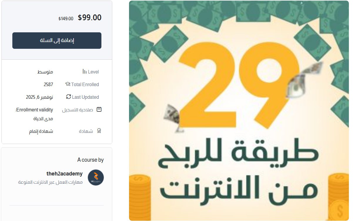 كورس 29 طريقة للربح من الانترنت H2 Academy هو بوابتك نحو عالم العمل الحر والربح من الإنترنت. يوفر هذا الكورس الفرصة لمن يرغب في تحقيق الدخل من خلال استراتيجيات متنوعة ومبتكرة.